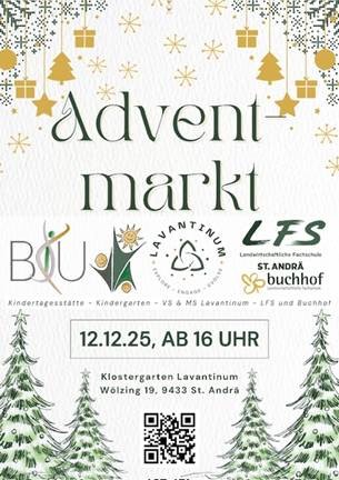 Am 12. Dezember 2025 ab 16 Uhr findet im stimmungsvollen Klostergarten des Lavantinums (Wölzing 19, 9433 St. Andrä) ein gemeinsamer Adventmarkt der Kinderbetreuung Lavantinum, des Kindergartens, der VS & MS Lavantinum, der Landwirtschaftlichen Fachschule St. Andrä und des Buchhofs statt.