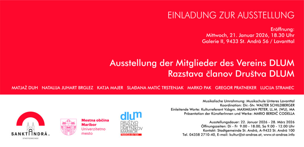 Die Stadtgemeinde St. Andrä lädt herzlich zur Ausstellung der Mitglieder des slowenischen Künstlervereins DLUM – Društvo likovnih umetnikov Maribor ein.