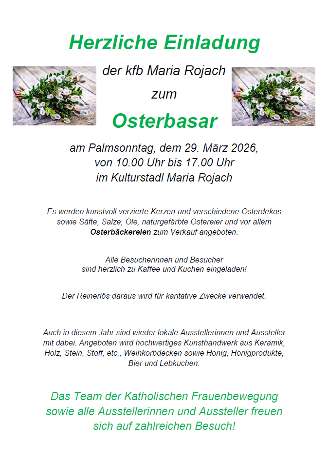 The Katholische Frauenbewegung Maria Rojach lädt herzlich zum Osterbasar am Palmsonntag, 29. März 2026, ein. Von 10:00 bis 17:00 Uhr erwartet die Besucherinnen und Besucher im Kulturstadl Maria Rojach ein stimmungsvoller Markt rund um Ostern und regionales Kunsthandwerk.