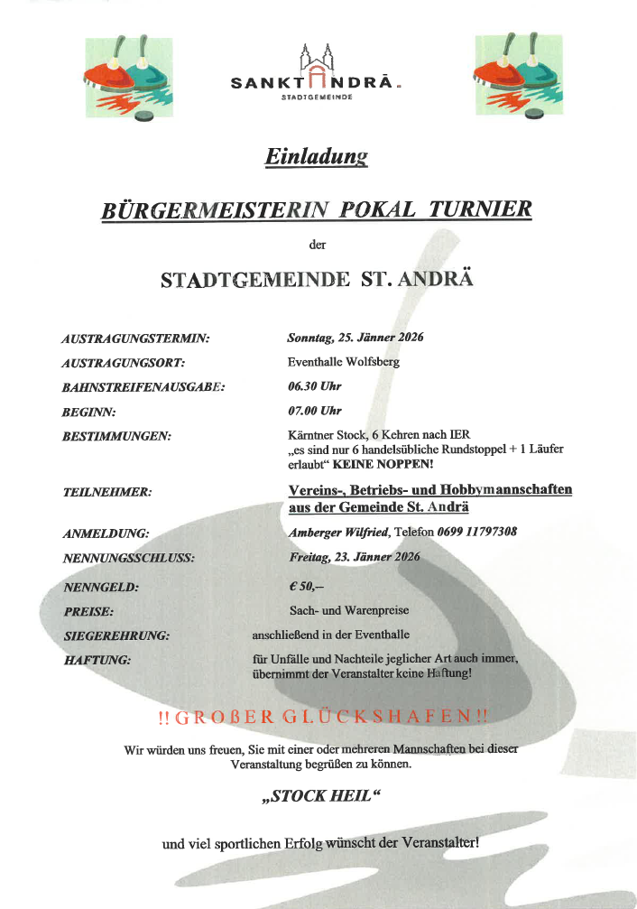 Am Sonntag, 25 Jänner 2026 findet in der Eventhalle Wolfsberg das Bürgermeisterin Pokal Turnier statt.
