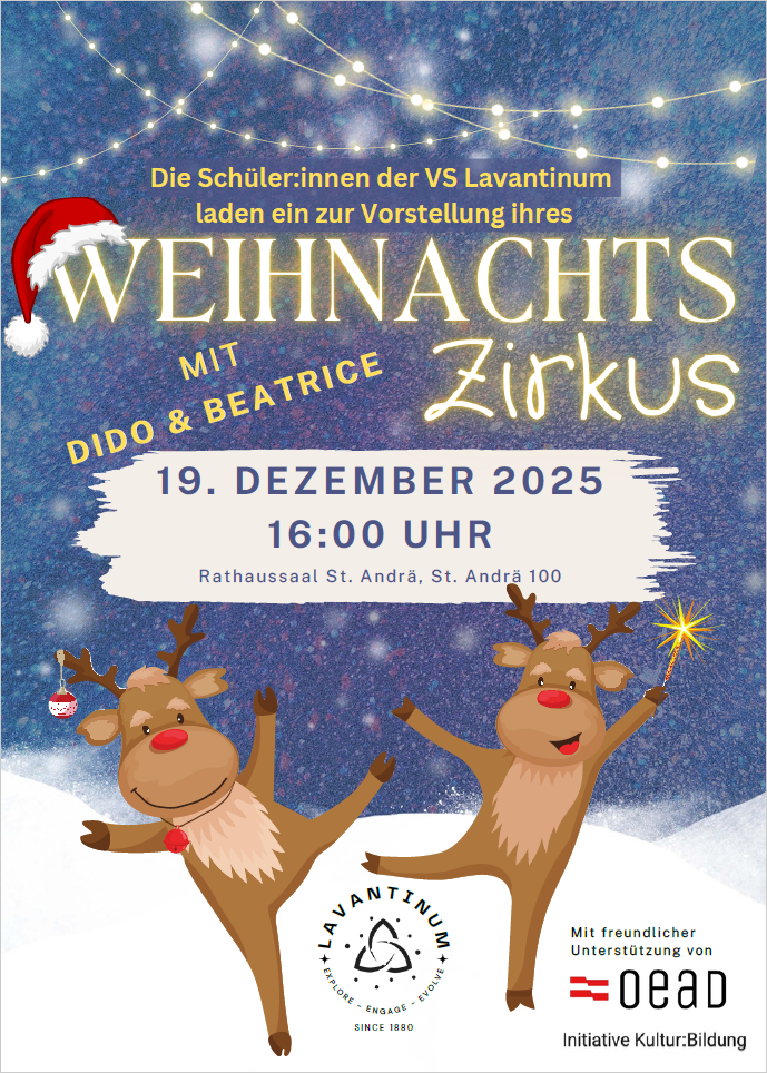 Am 19. Dezember 2025 laden die Schülerinnen und Schüler der VS Lavantinum herzlich zur diesjährigen Aufführung des Weihnachtszirkus ein.