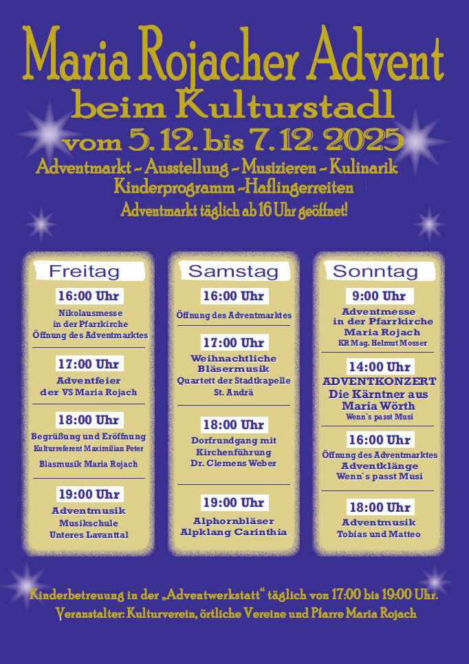 Neben dem vielfältigen musikalischen Programm gibt es eine Kinderbetreuung in der „Adventwerkstatt“ täglich von 17:00 bis 19:00 Uhr, Haflingerreiten, kulinarische Genüsse, Handwerkskunst und ein gemütliches Beisammensein beim Kulturstadl.