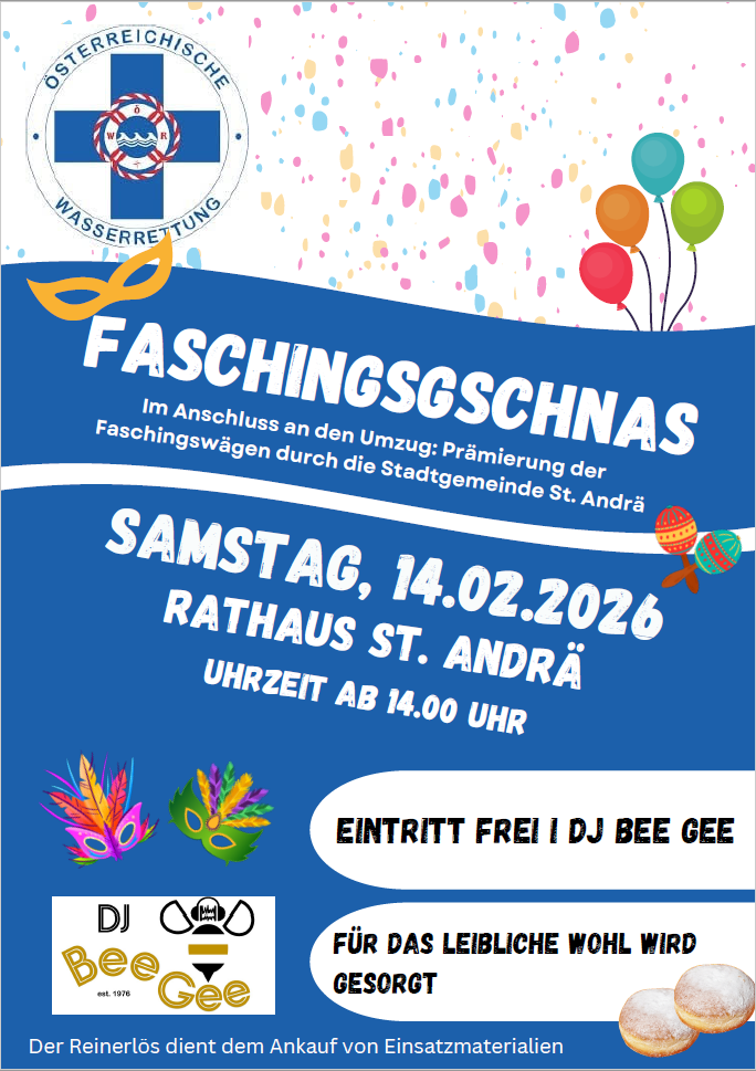 Am Samstag, dem 14. Februar 2026, lädt die Wasserrettung St. Andrä herzlich zum traditionellen Faschingsgschnas ins Rathaus St. Andrä ein. Ab 14.00 Uhr erwartet die Besucherinnen und Besucher ein buntes Faschingstreiben mit Musik von DJ BEE GEE, bester Stimmung und kulinarischer Verpflegung.