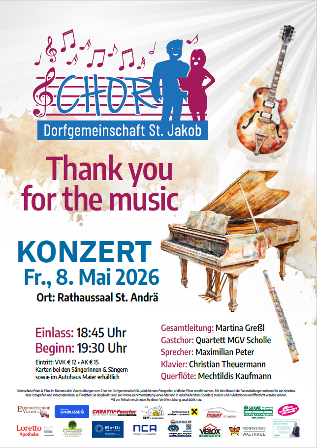 Am Freitag, den 8. Mai 2026, lädt der Chor der Dorfgemeinschaft St. Jakob zu einem stimmungsvollen Konzertabend unter dem Titel „Thank you for the Music“ in den Rathaussaal St. Andrä ein.