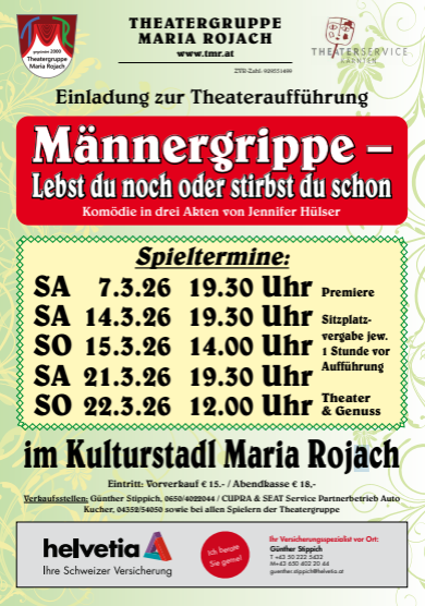 Die Theatergruppe Maria Rojach lädt herzlich zur neuen Komödie in drei Akten von Jennifer Hüsler ein. Unter dem Titel „Männergrippe – Lebst du noch oder stirbst du schon“ erwartet das Publikum ein humorvoller Theaterabend voller Situationskomik und Wortwitz.
