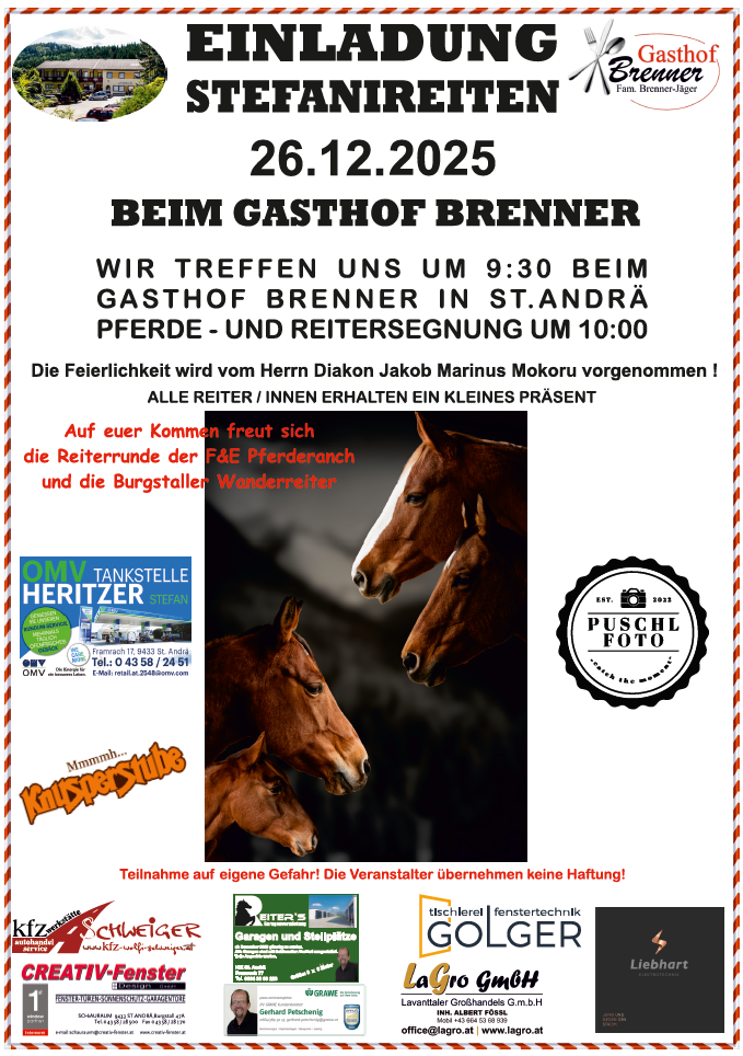 Auch heuer laden die Reiterrunde der F&E Pferderanch und die Burgstaller Wanderreiter herzlich zum traditionellen Stefanireiten am 26. Dezember 2025 ein.